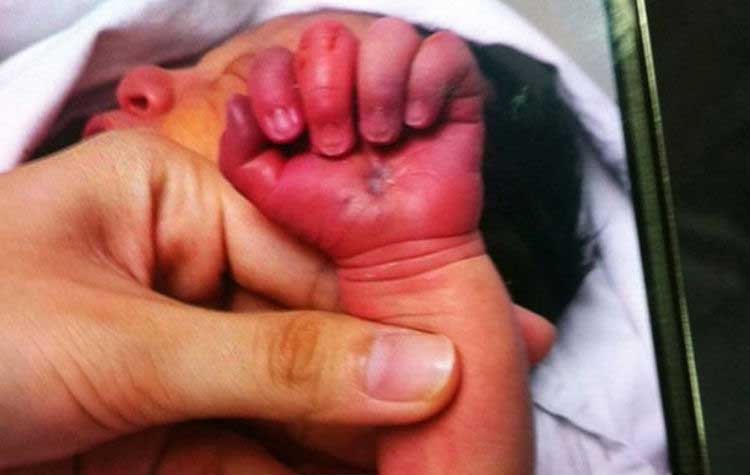 Covered with bite marks on his palm and back of his hand, the crying baby was rushed into emergency care to be treated.